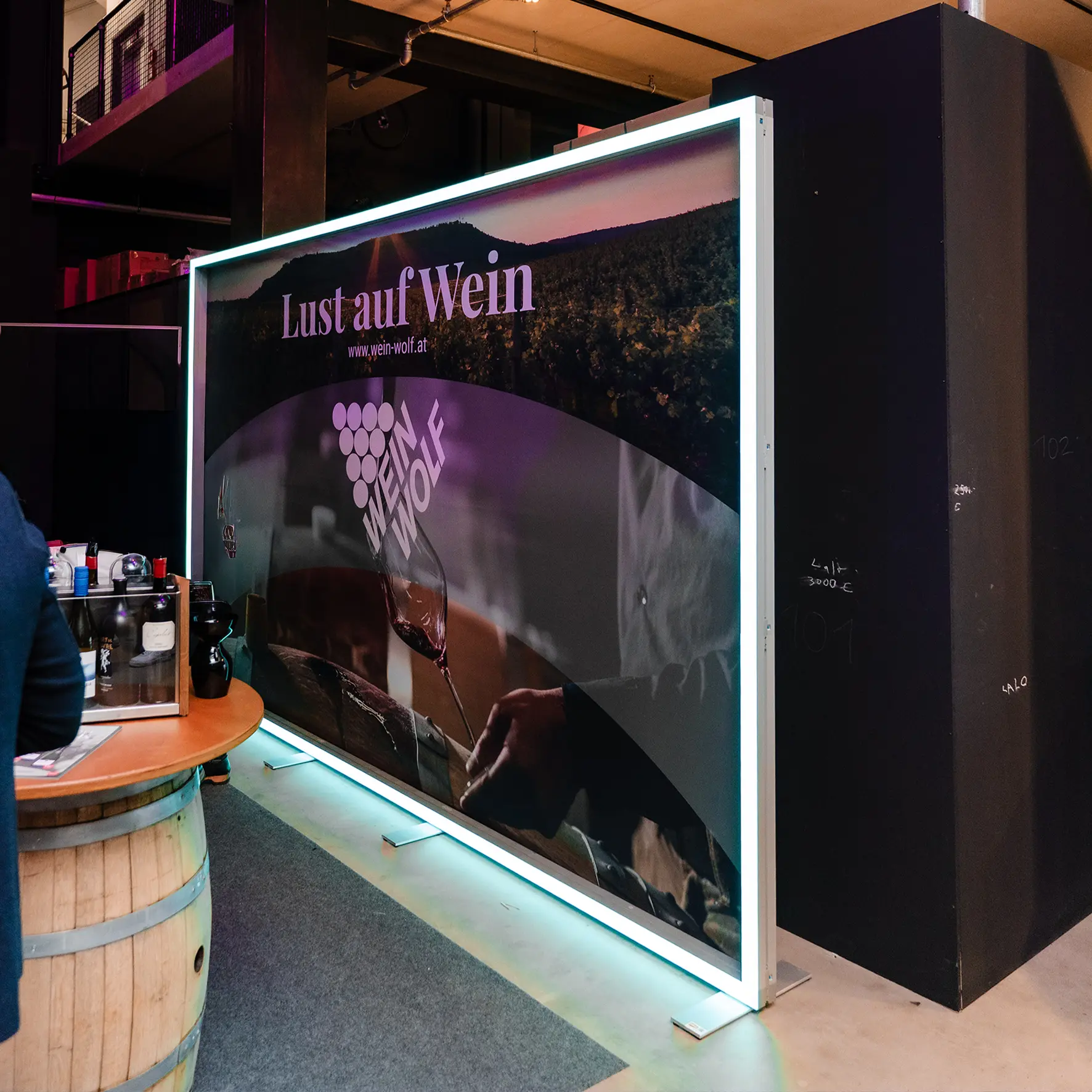 Der LED Line Rahmen ist die ideale Lösung für aufmerksamkeitsstarke Präsentationen im Innenraum. Der hochwertige Aluminiumrahmen wird mit einem einfach einspannbaren Textildruck ausgestattet, der sich jederzeit schnell austauschen lässt. Die Besonderheit: Der Rahmen selbst ist umlaufend beleuchtet und sorgt damit für einen eindrucksvollen, gleichmäßigen Leuchteffekt, der jede Grafik perfekt in Szene setzt.