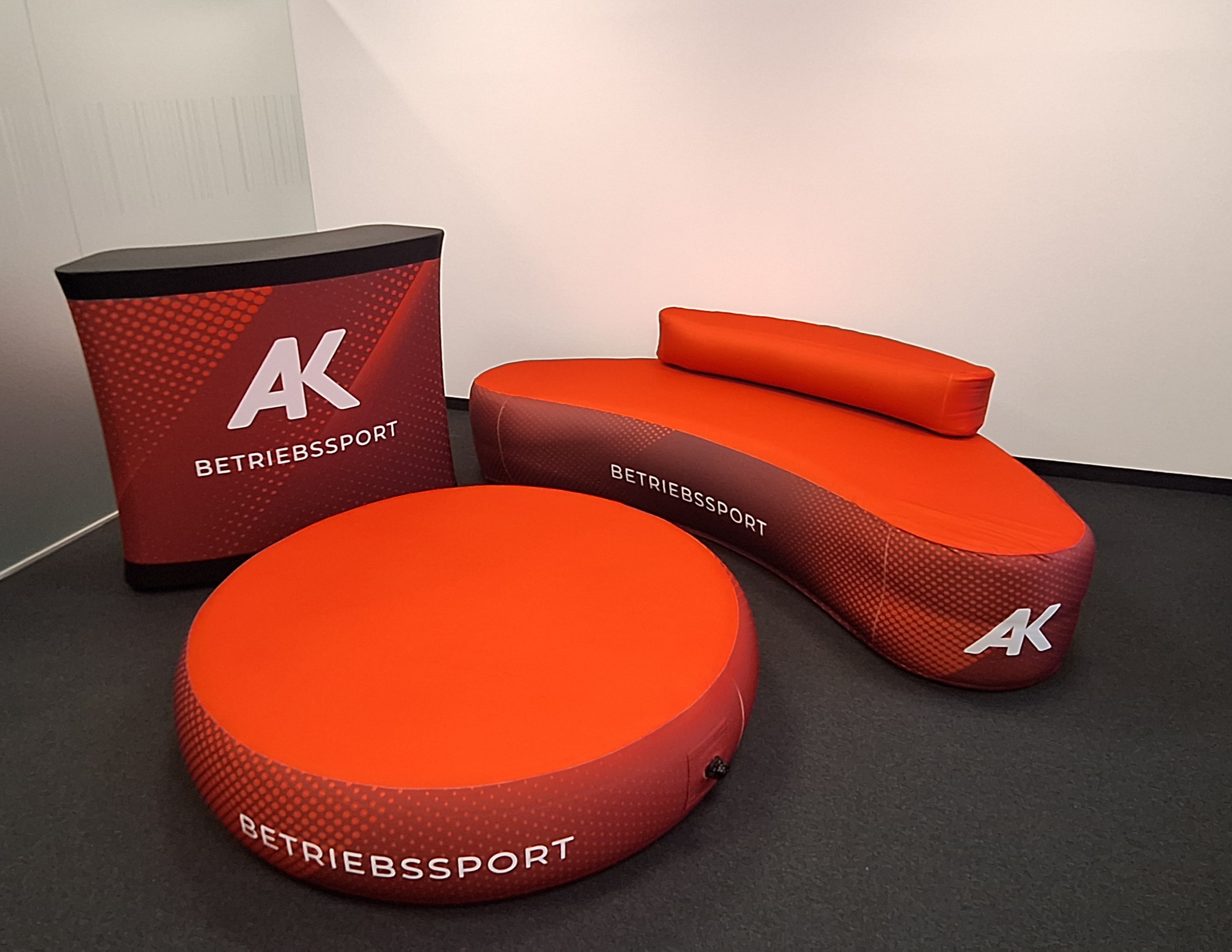 Aufblasbare pneumatische Couch für Messen, Events und Outdoor. Komfortabel, mobil und individuell bedruckbar. Perfekt für Marketing und Promotion.