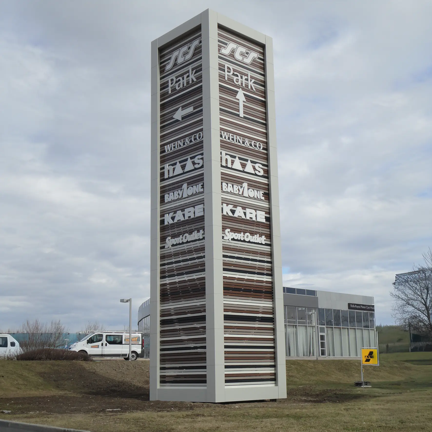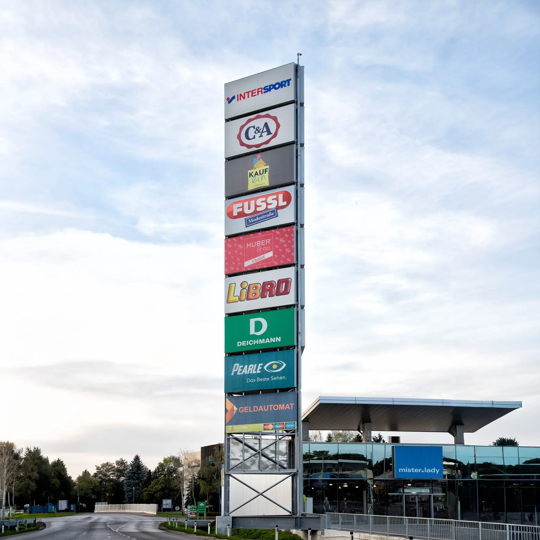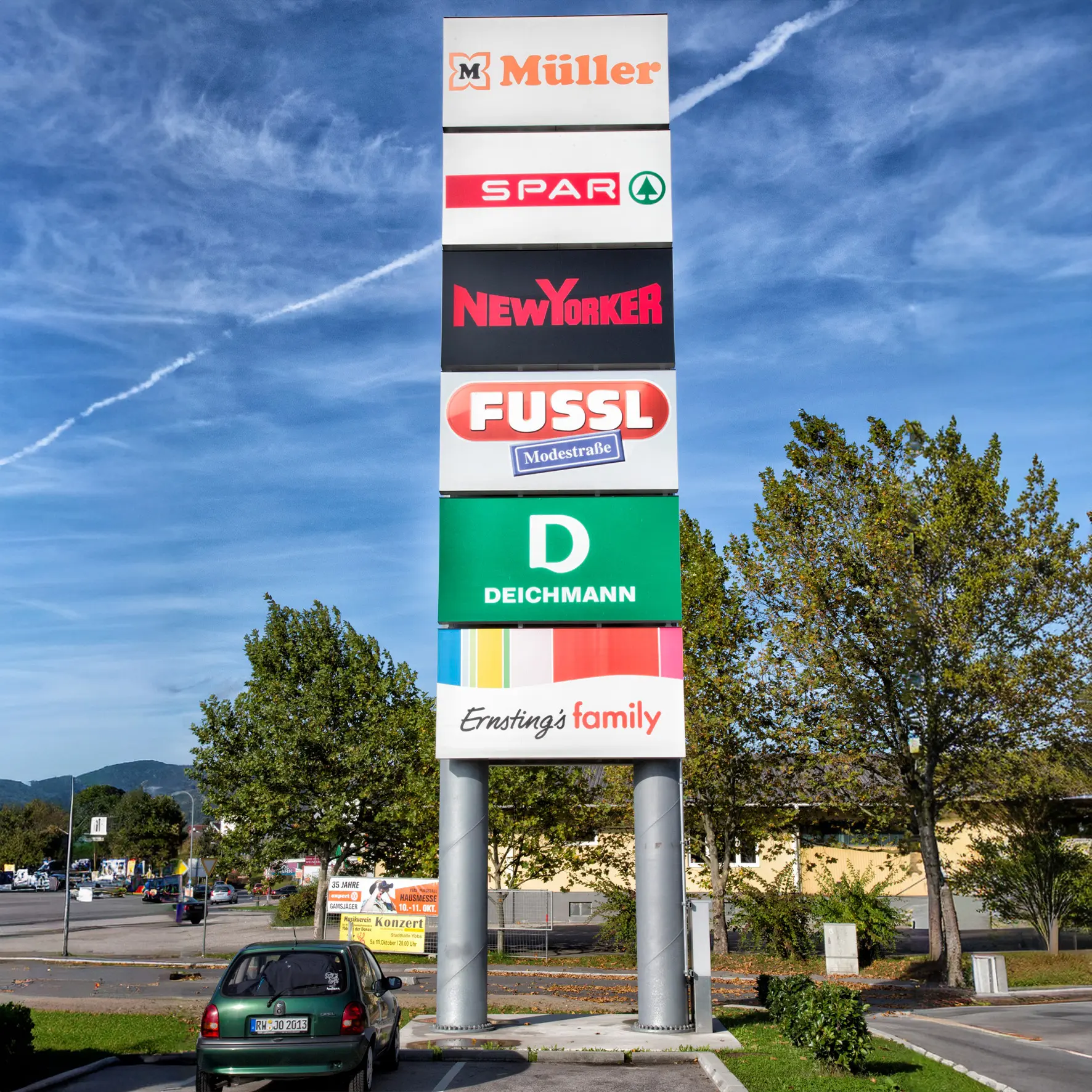 • Autohäuser & Gewerbeparks: Großflächige, beleuchtete Türme für Markeninszenierung