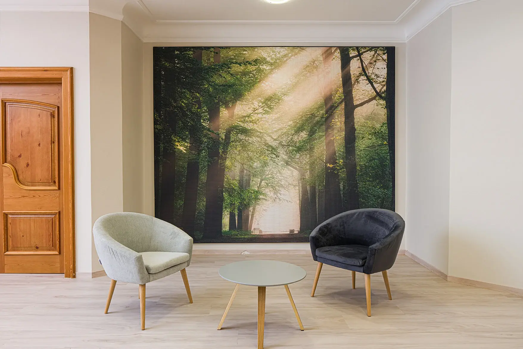 Großformatige Stimmungsbilder oder Wandbespannungen werden bei inno aktiv genau auf Ihre Wünsche hin angepasst. Von der Größe und dem Format, bis hin zur Gestaltung Ihres Textildrucks. Zusätzlich sind unsere verwendeten Materialien flammfest und können sowohl im Innen- als auch im Außenbereich verwendet werden. Bei Bedarf kann der Textildruck auch hinterleuchtet werden und wirkt so noch eindrucksvoller. Wir beraten Sie gerne bei der Wahl und Gestaltung Ihres Drucks, denn großformatiger Textildruck kann für unterschiedliche Zwecke eingesetzt werden.